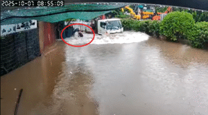 Nguy hiểm trên phố Kẻ Giàn Hà Nội khi xe tải lao nhanh qua đường ngập gây hoảng loạn người đi bộ